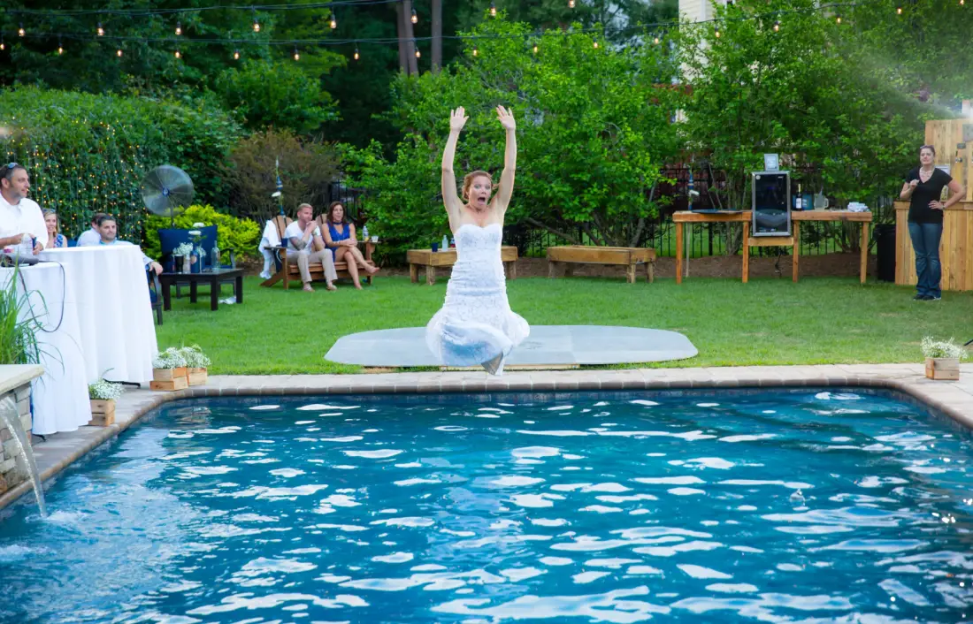 After the ceremony, the photographer led us into the garden while the light was doing its most generous work. The grounds were stunning—manicured hedges, old oaks, roses that looked like they’d been practicing all year for this exact afternoon. The pool sat beyond the hedges, glassy and harmless, a prop we hadn’t invited into our plans. It had been there during the venue tour, and I’d asked the coordinator specifically, “Can we section that area off?” She’d assured me it would be cordoned with velvet rope and tasteful signage.